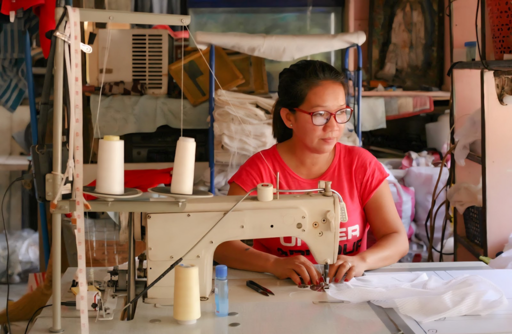 A partner mother at Habi Lifestyle works on a sewing machine, transforming materials into handcrafted products. Habi emphasizes that women like her are not recipients of charity but genuine artisans whose skill and dignity form the heart of the enterprise. (Habi Lifestyle, 2021)
