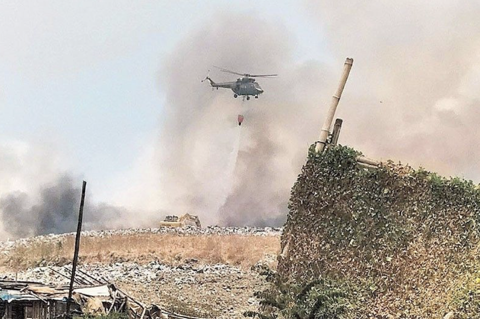 A Philippine Air Force helicopter helps suppress the Navotas landfill fire in Barangay Tanza 2 on April 11, 2026. Source: Navotas Public Information Office (2026), published in The Philippine Star.