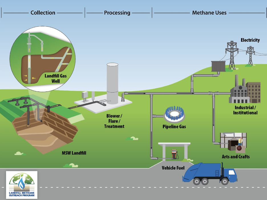 Landfill Gas (primarily methane) Collection, Treatment, and Utilization. Gas generated from decomposing waste is captured through wells installed within the landfill and transported via a piping system to a treatment facility, where it is processed through blowers and flaring or purification systems. The recovered methane is then distributed for various end uses, including electricity generation, industrial applications, pipeline gas, vehicle fuel, and small-scale uses such as arts and crafts. Overall, the figure demonstrates how landfill gas can be transformed from a waste byproduct into a valuable energy resource through proper collection and management systems. Adapted from U.S. Environmental Protection Agency (2021).